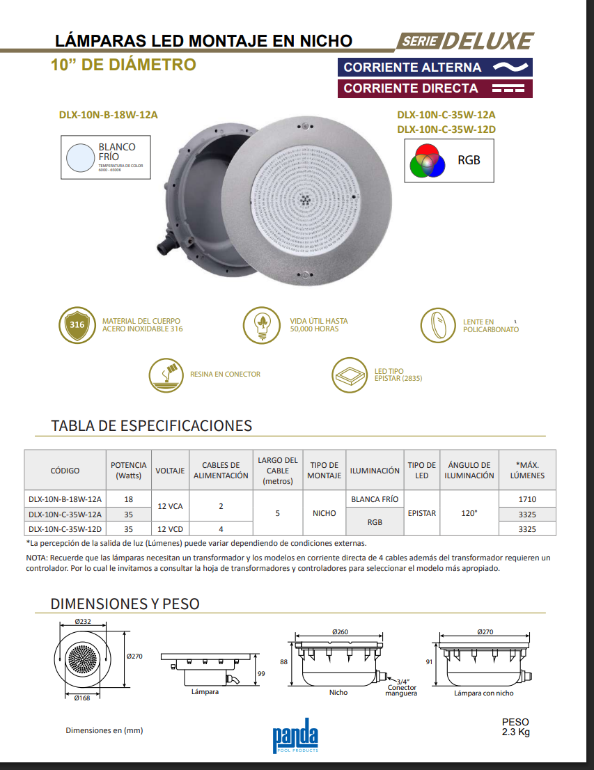 Lampara LED plana para piscina 10W blanco puro DLX-3-B-10W-12D Deluxe Panda