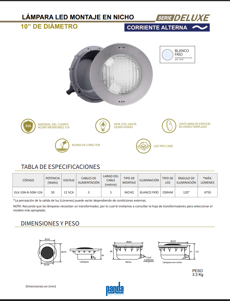 Lampara LED con nicho para piscina 12 W RGB DLX-5N-C-12W-12A Deluxe Panda
