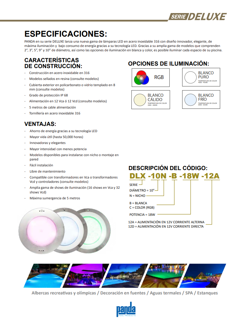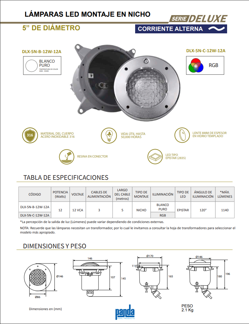 Lampara LED con nicho para piscina 12 W RGB DLX-5N-C-12W-12A Deluxe Panda