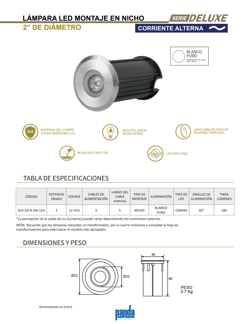 Lampara LED para piscina 3W con nicho blanco puro DLX-2N-B-3W-12A Deluxe Panda
