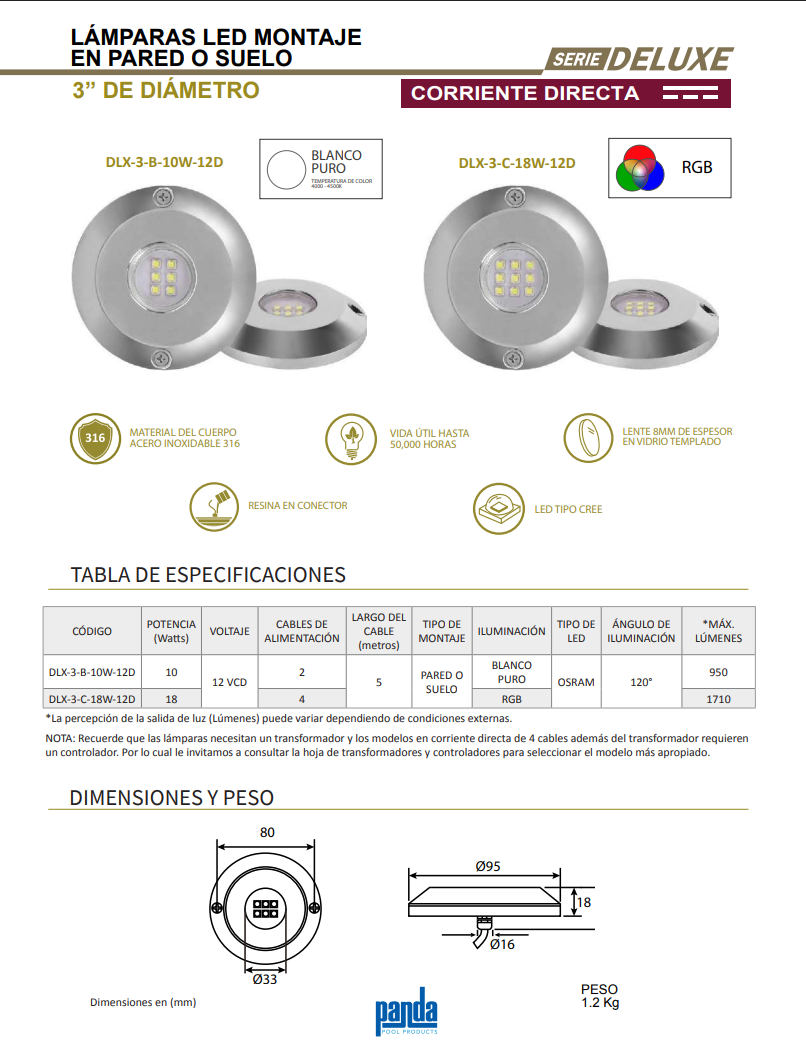Lampara LED Plana para piscina 18 W RGB DLX-3-C-18W-12D Deluxe Panda